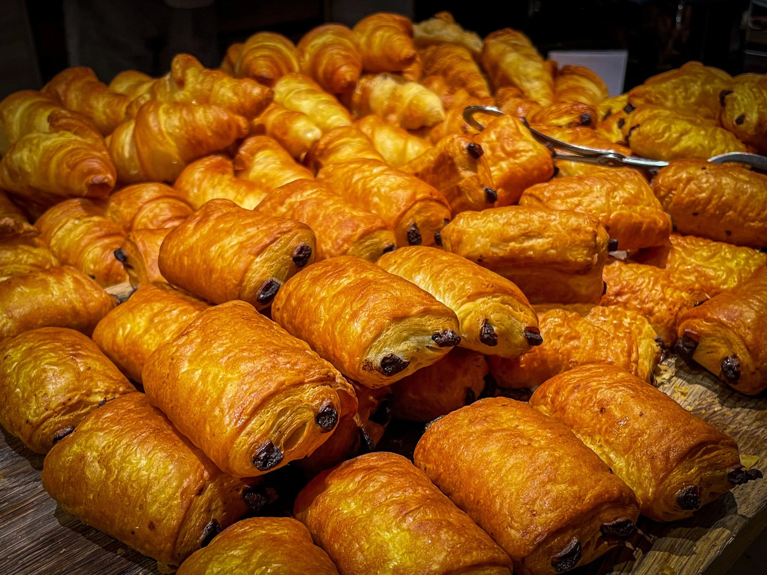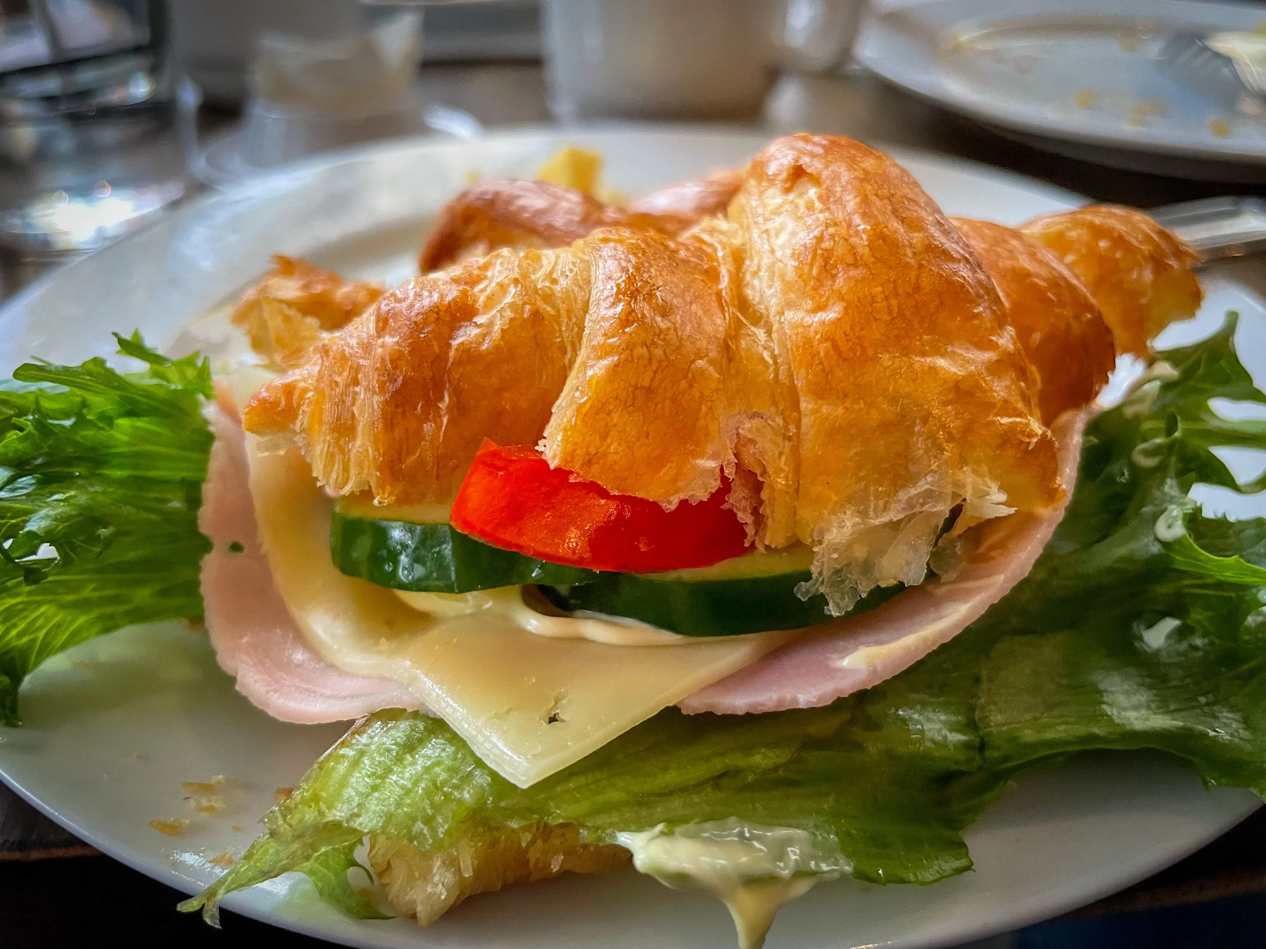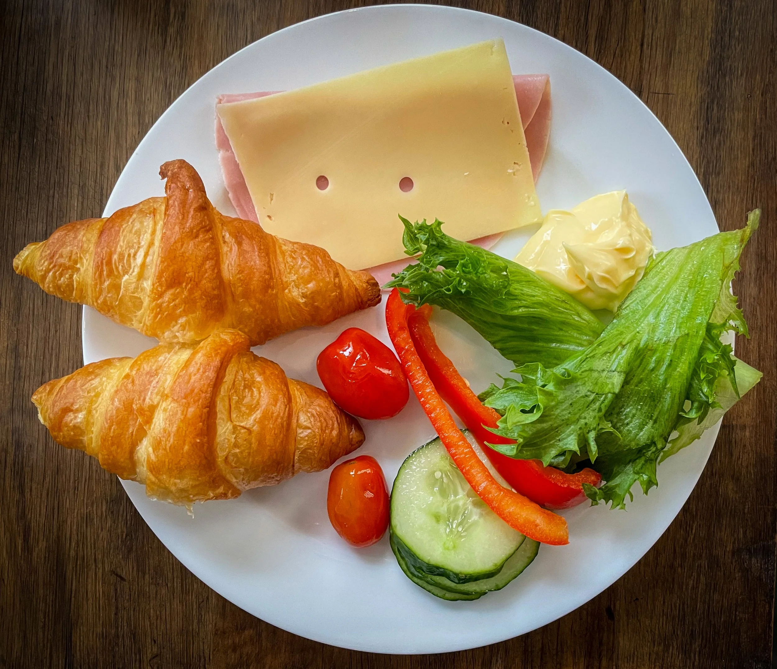 Nina put together a small “dessert plate” with a chocolate croissant, which quickly became the subject of jokes at our table. You could hardly get away with calling it that in France, where it would of course be a pain au chocolat — and at least twice the size. I, on the other hand, went the savory route and built my own “special croissant”: stuffed with cheese, ham, mayonnaise, salad, and vegetables. A creation that really demands a croissant of substance — these miniature ones barely managed the task, but it was still delicious in its own unruly way.