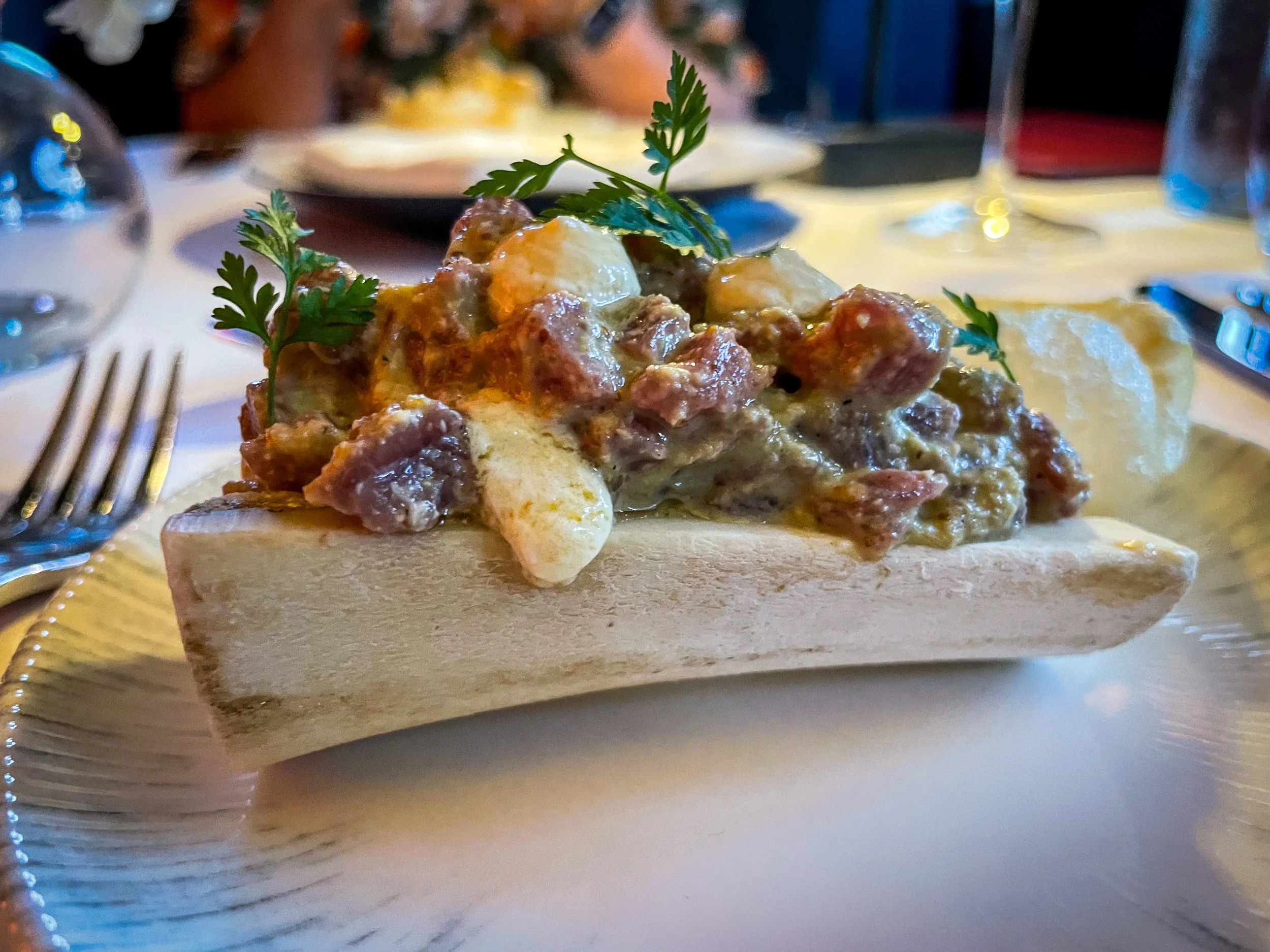 We kicked things off with beef tartare topped with bone marrow emulsion and pork crackling. The tartare had a bright, tangy sauce that cut through the richness, with a smoky note that reminded us of shish kebab. Paired with a pinot noir (served a touch too cold, but still working nicely), it was an excellent start.