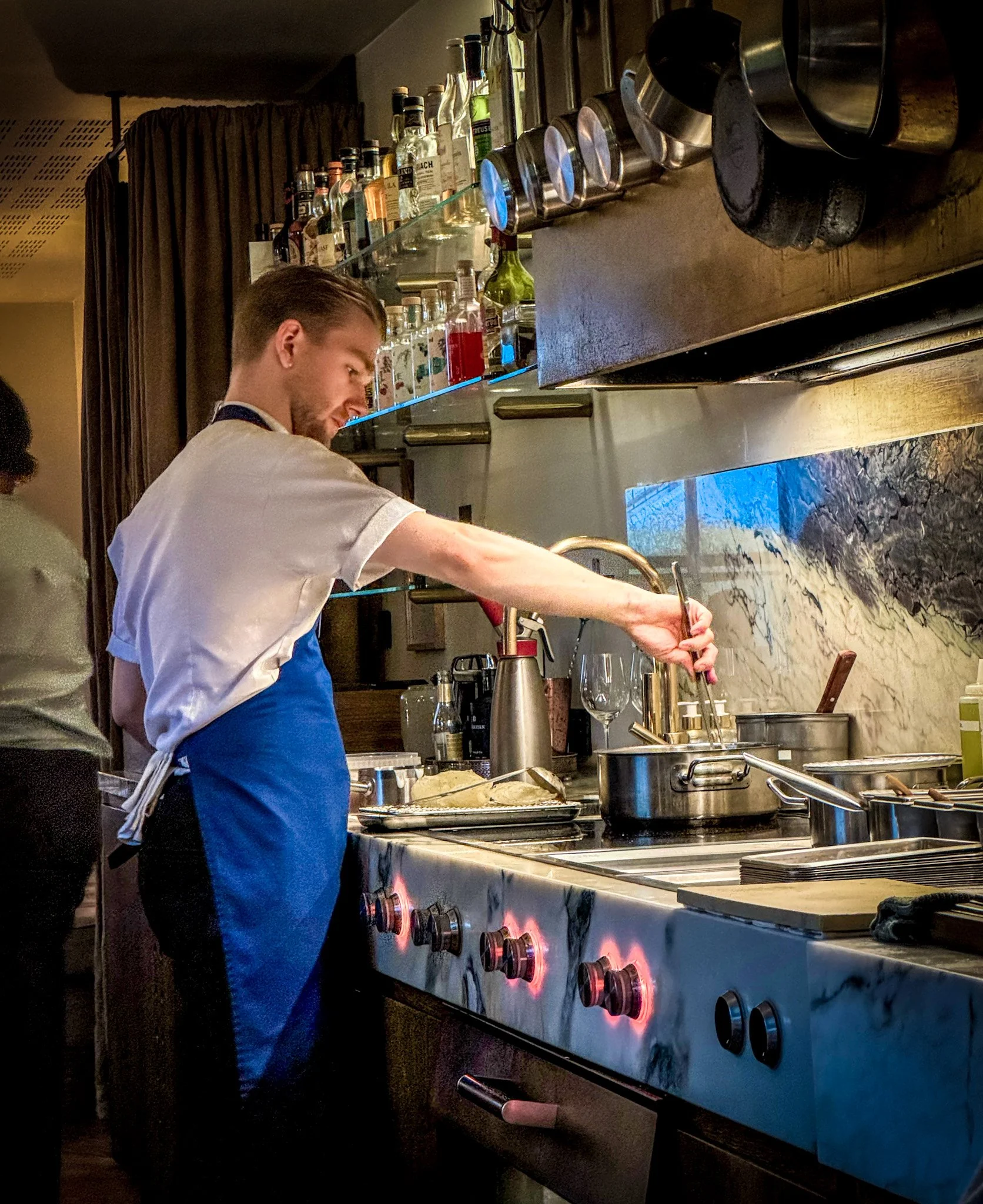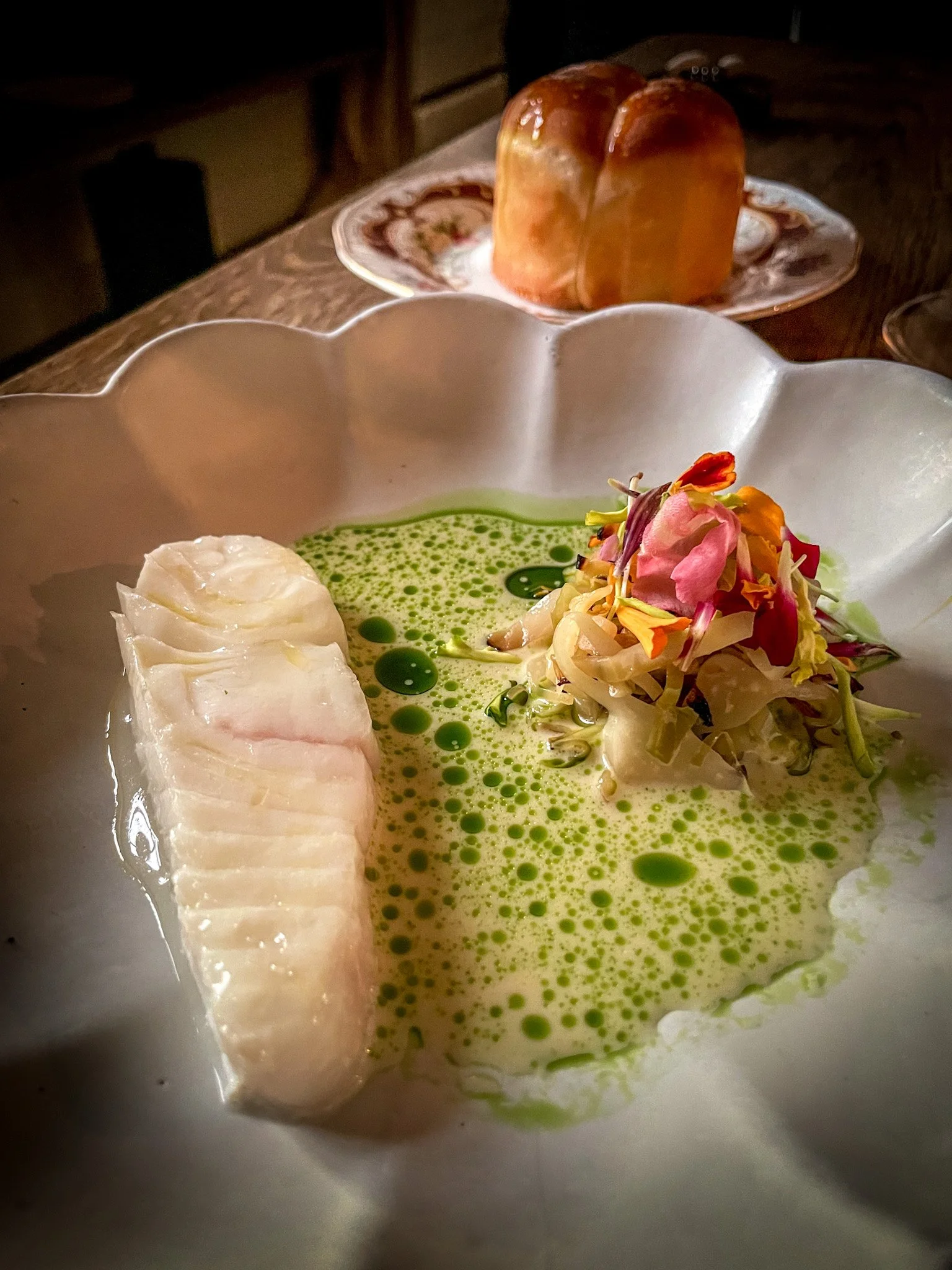 Pearl-white halibut, barely poached until it quivers. A broth made from the fish’s own head, reduced with cream and wine until it hums. Fermented cabbage for edge, caramelised apple for sweetness, and a swirl of herb oil like a painter’s stroke.