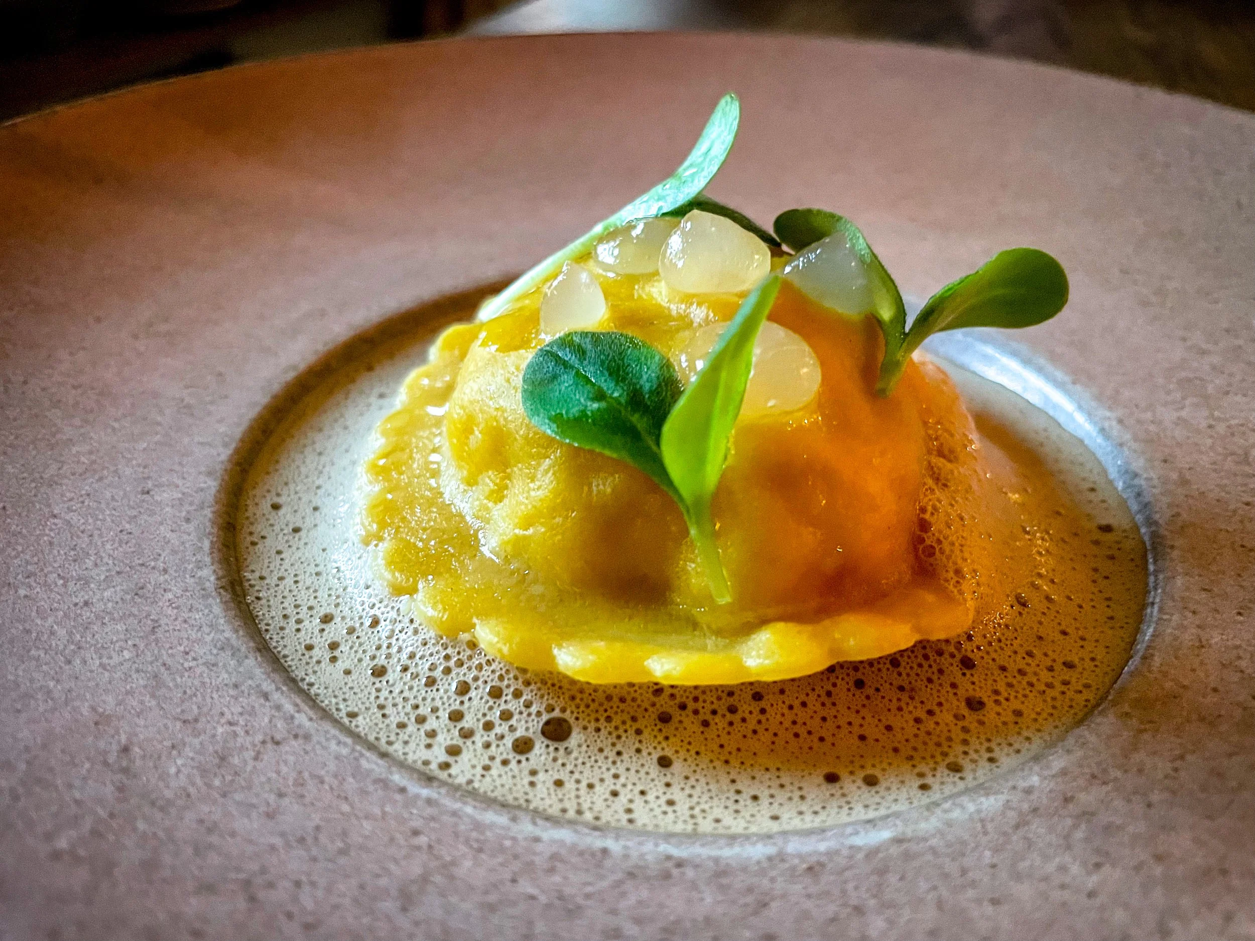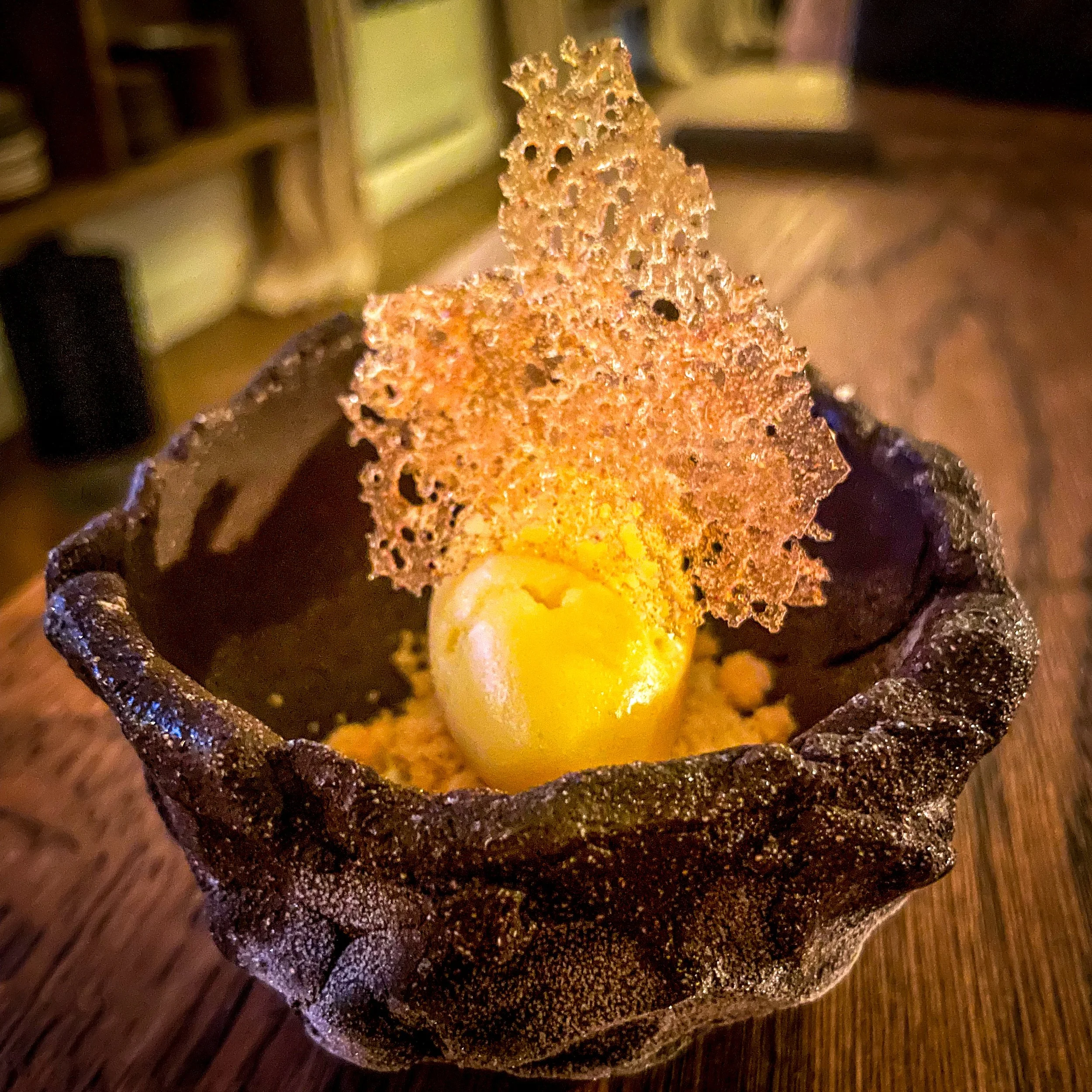 A moment later came the sound — the shattering crack of tempura. Hidden underneath the fragile lattice: sweet monkfish cheek, dotted with curry emulsion and tiny flower petals. Playful, nostalgic, and utterly serious at the same time. The chef mentioned his childhood in Norwich with fish and chips — the dish was a beutiful hommage. This was memory, reimagined through technique.
