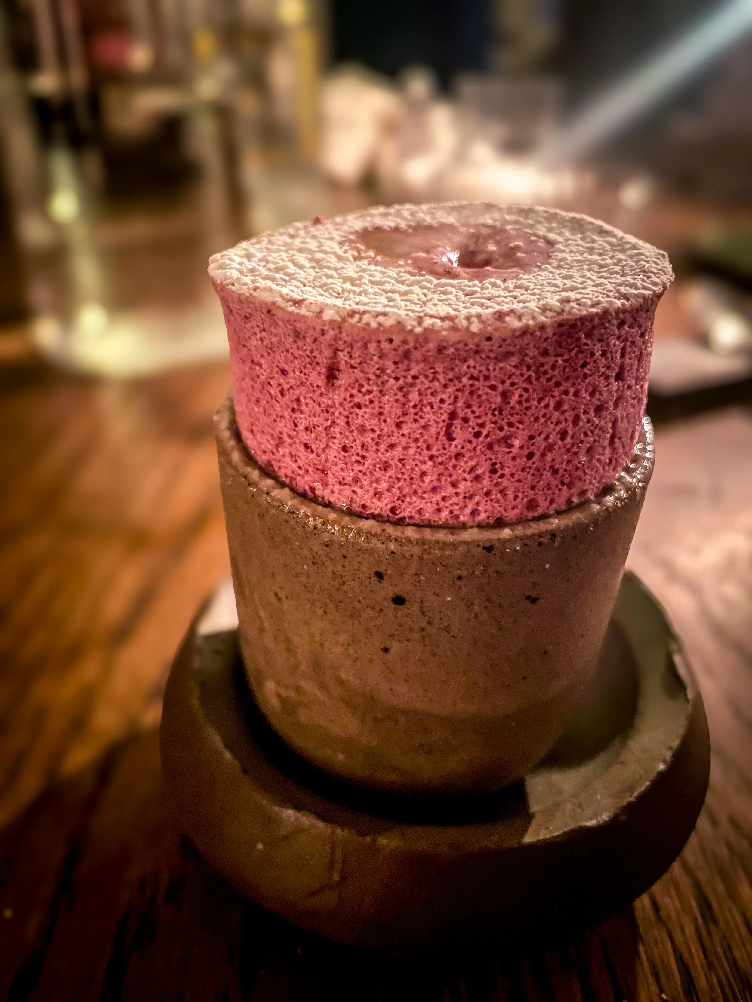 Then, a warm blackcurrant soufflé, tall and proud in its ceramic cup, followed by a soft swirl of gingerbread ice cream — a taste of Christmas folded into November.