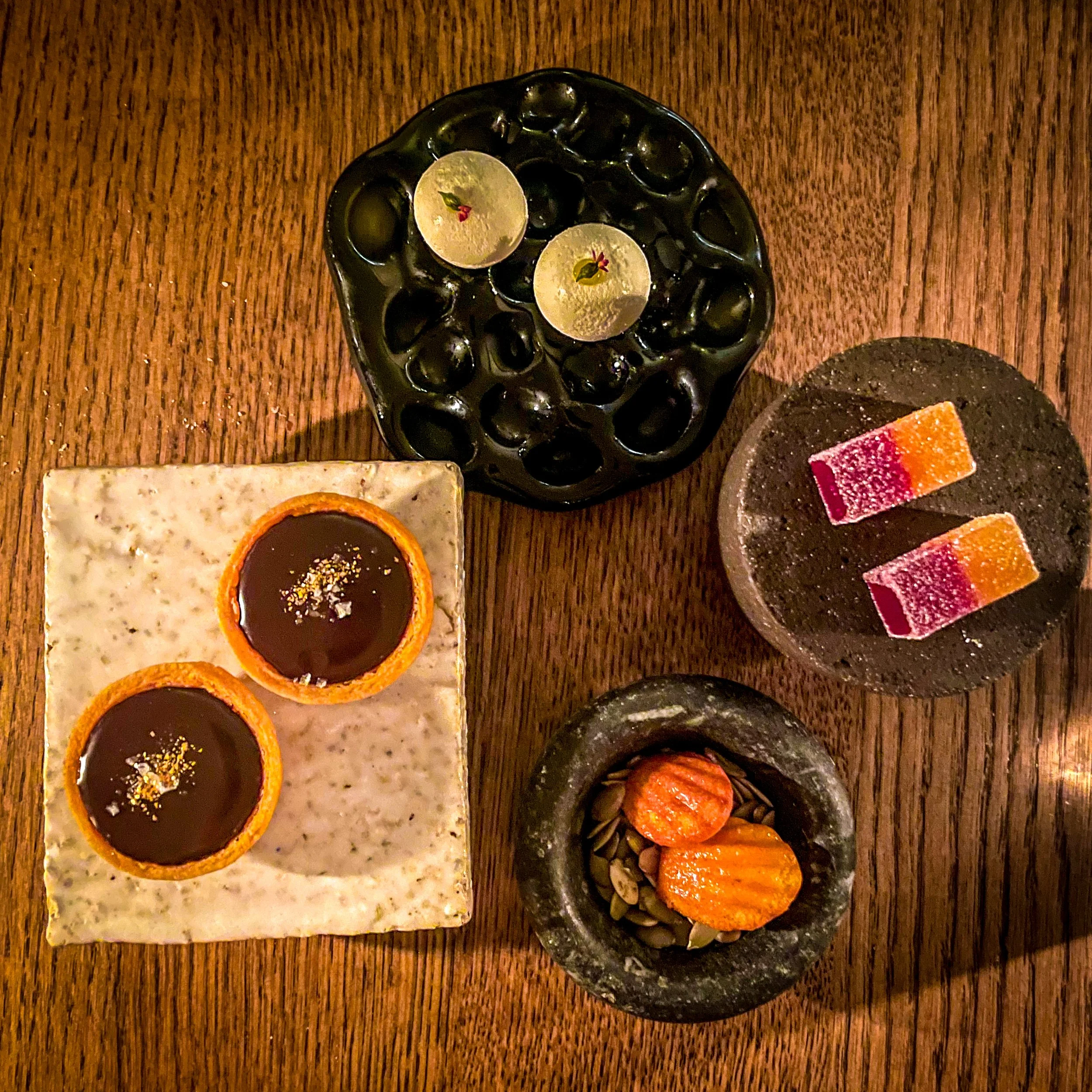 Dessert opened on a bright note: white chocolate and tarragon namelaka — a Japanese-style mousse so creamy it barely held its shape — paired with vanilla cookie crumble, mandarin–orange sorbet, and a Szechuan-pepper sugar tuille that tingled playfully on the lips.