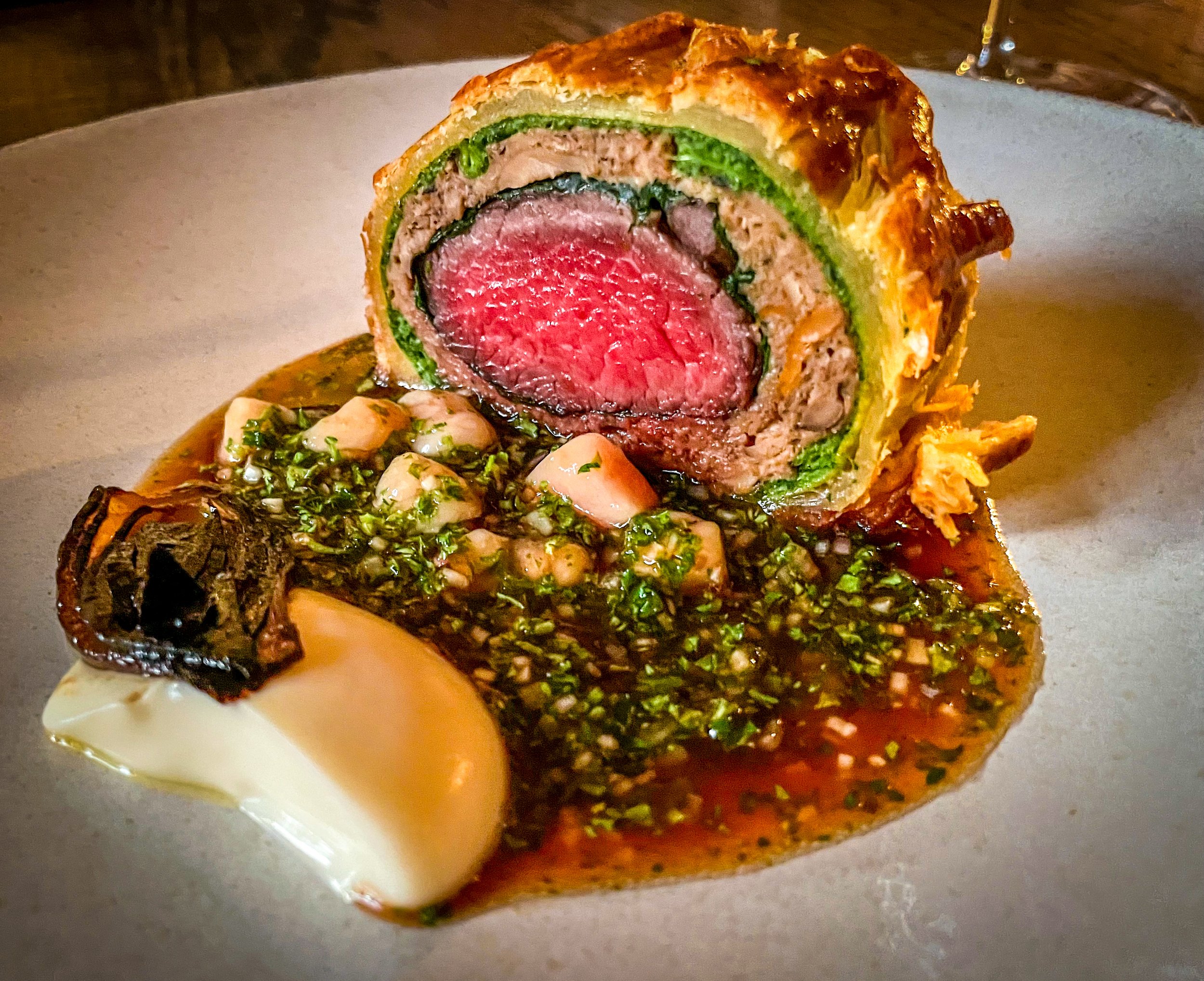 The beef Wellington came next. Perfectly cooked beef from Ustein Kloster’s “Pantheon” cow, wrapped in spinach, mushroom and chicken mousse, herb pancake, and house-made puff pastry. The bordelaise sauce — red wine, bone marrow, shallots, tarragon, and a hint of sherry vinegar — was pure theatre. Every cut revealed the kind of precision and patience that makes a dish immortal.