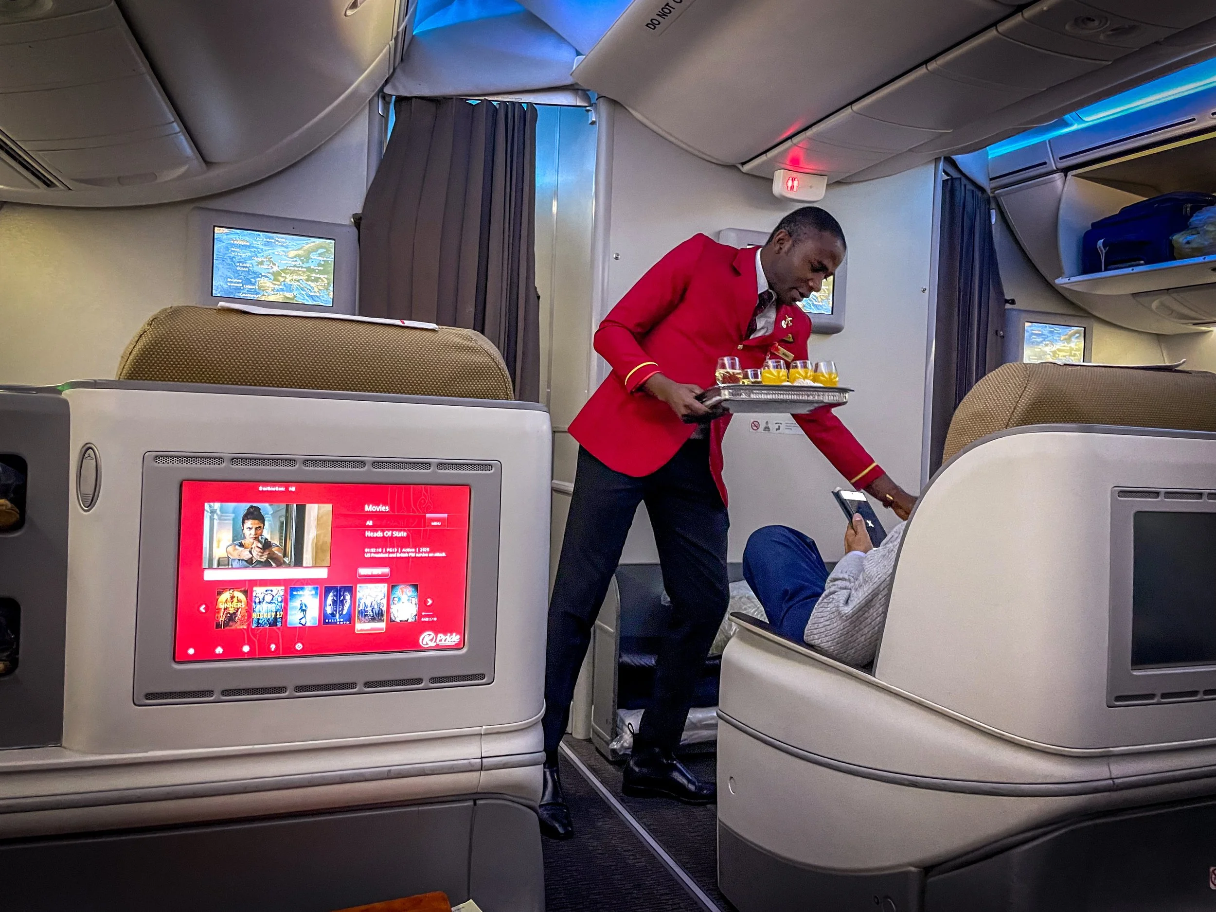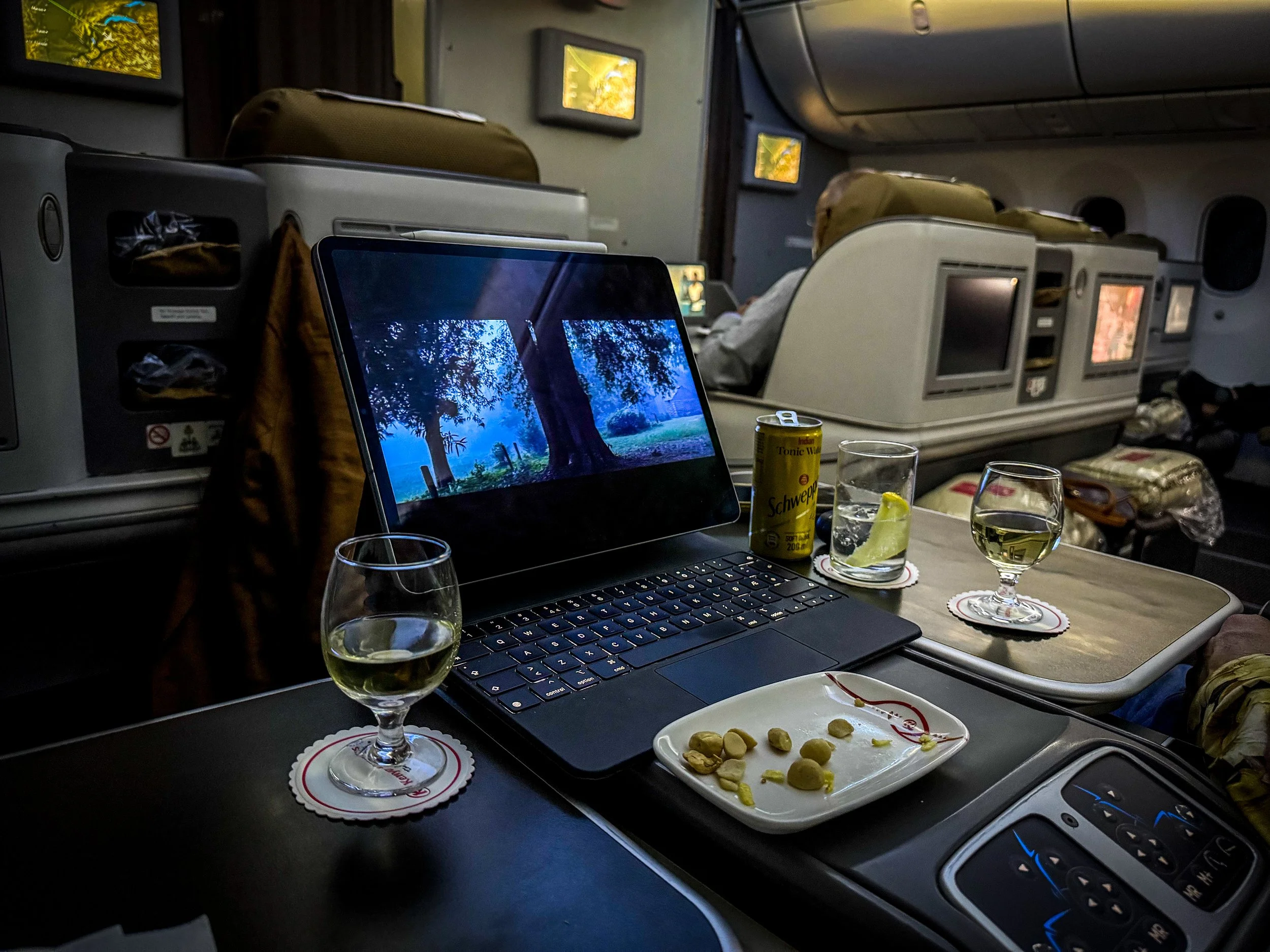The London–Nairobi leg was where the journey finally began to feel indulgent. As soon as we settled into our Kenya Airways Business Class seats, the crew arrived with champagne and a small bag of nuts—the simple but reassuring signal that now you can relax. We queued up a film, reclined into that delicious almost-horizontal position, and let time drift somewhere above the Mediterranean. It was the kind of flight where everything felt quiet and effortless, as if the world outside had pressed pause just for us.