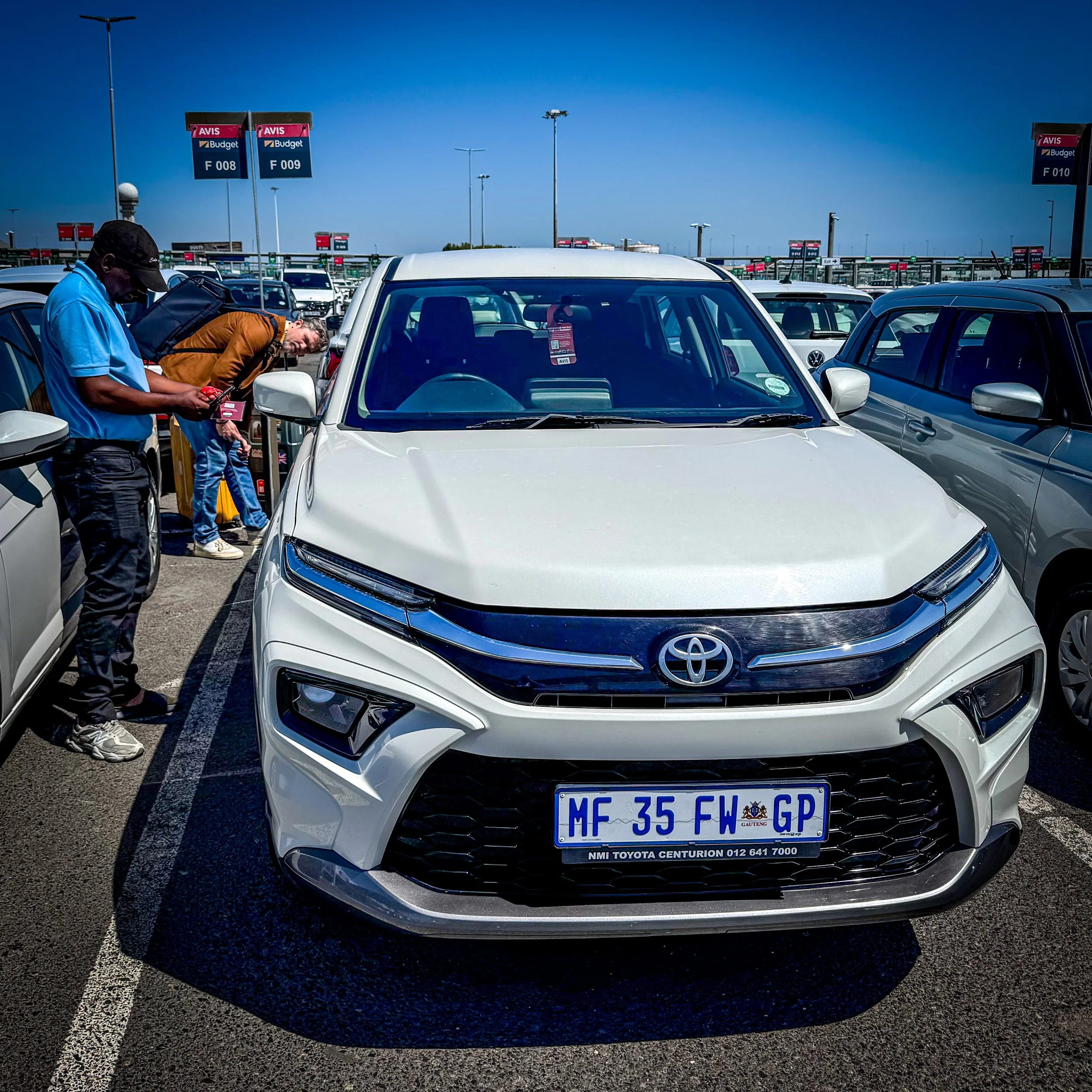 At Avis we rented a Toyota Urban Cruiser. Not the Land Cruiser Thomas dreamed of, but a functional companion. The real challenge was left-hand driving: drifting toward the yellow line, activating wipers instead of indicators, and Nina displaying heroic calm.