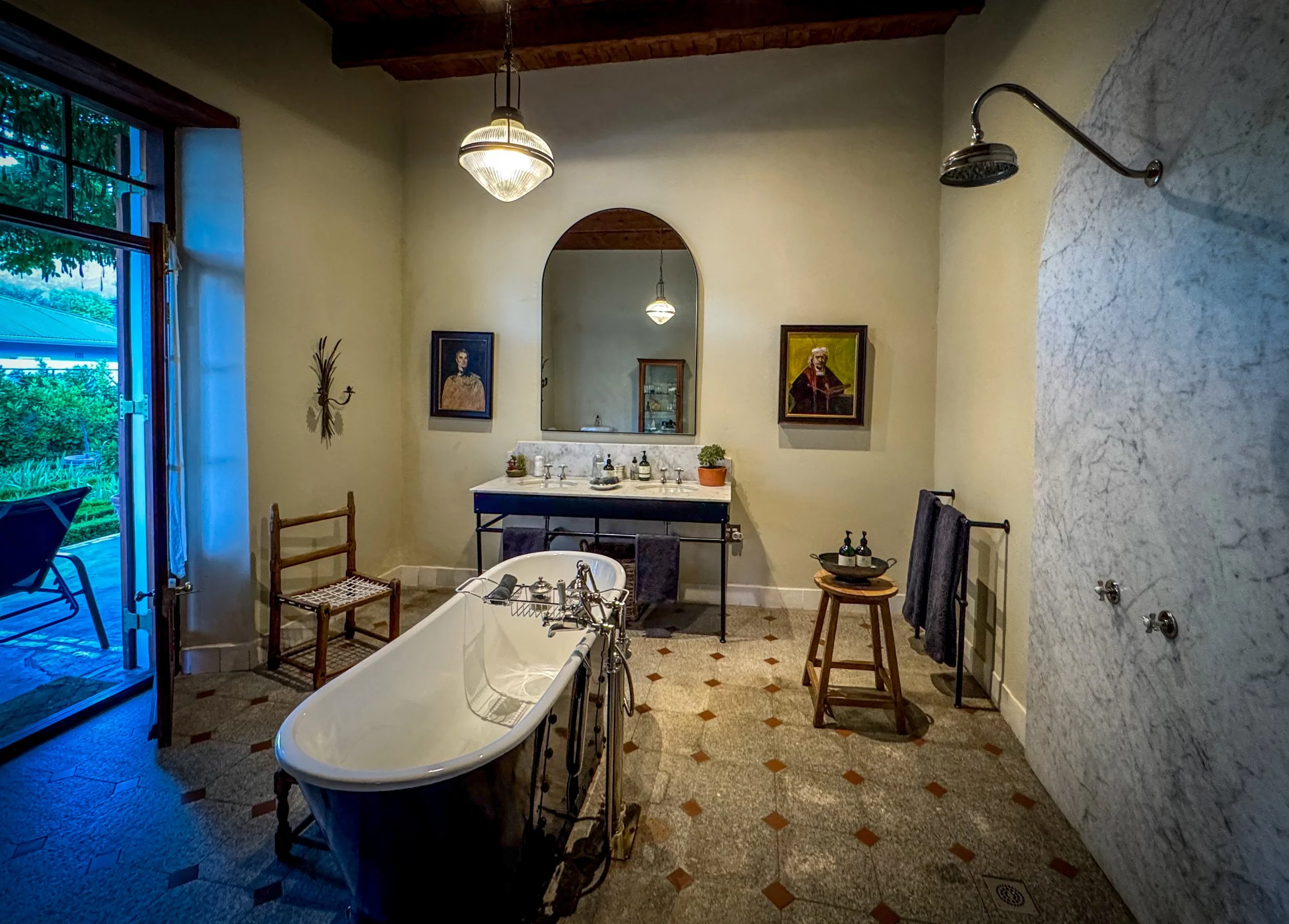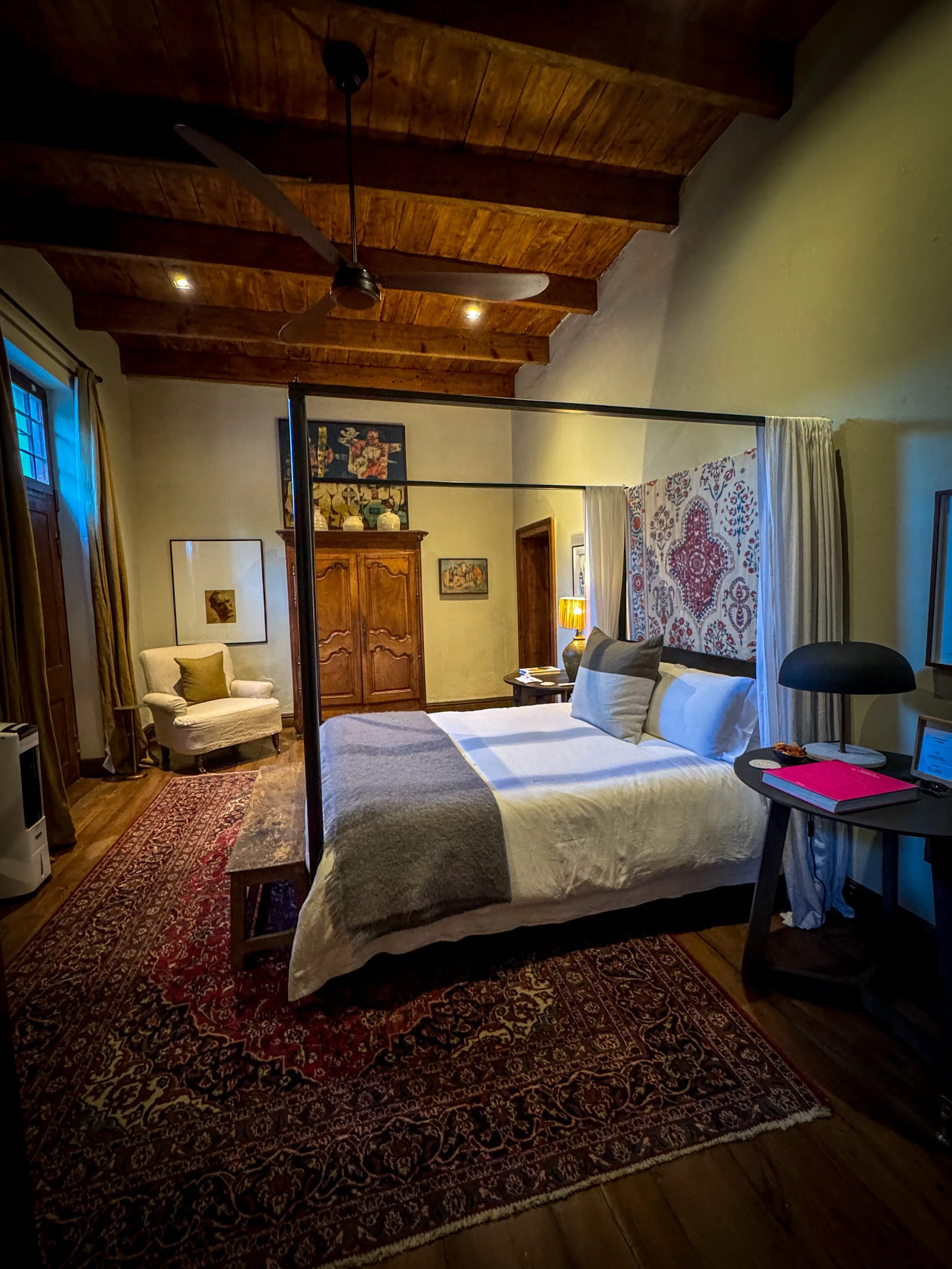 The lodge was beautiful — quiet, whitewashed, with a Ridgeback and a Golden Retriever as welcoming committee. Unfortunatly no pictures of the dogs, but Nina took some nice shots of our room and the house.