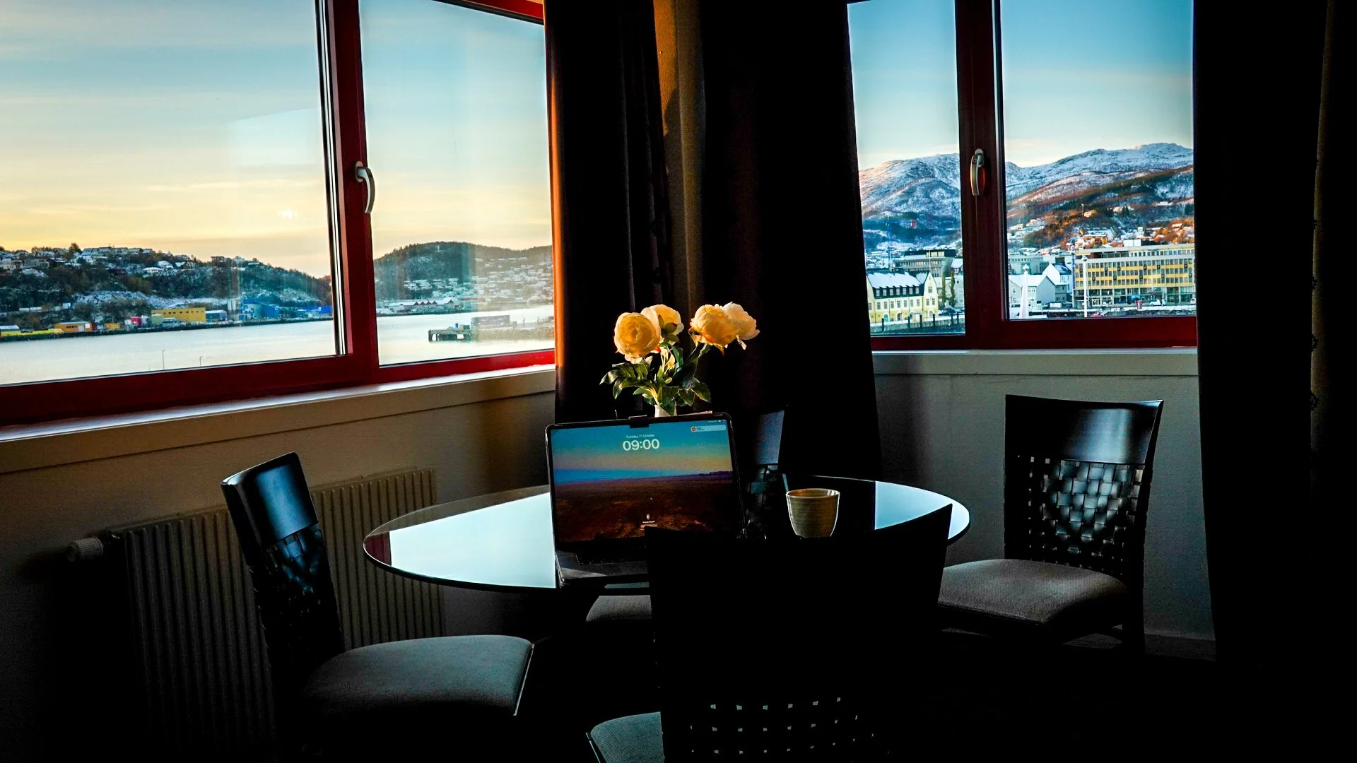 The gym, just a few doors away, turned out to have a surprise: a sauna with a view straight across the fjord. While running intervals, I could see the Hurtigruten slowly passing by, framed by the first rays of light hitting the snow-covered mountains.