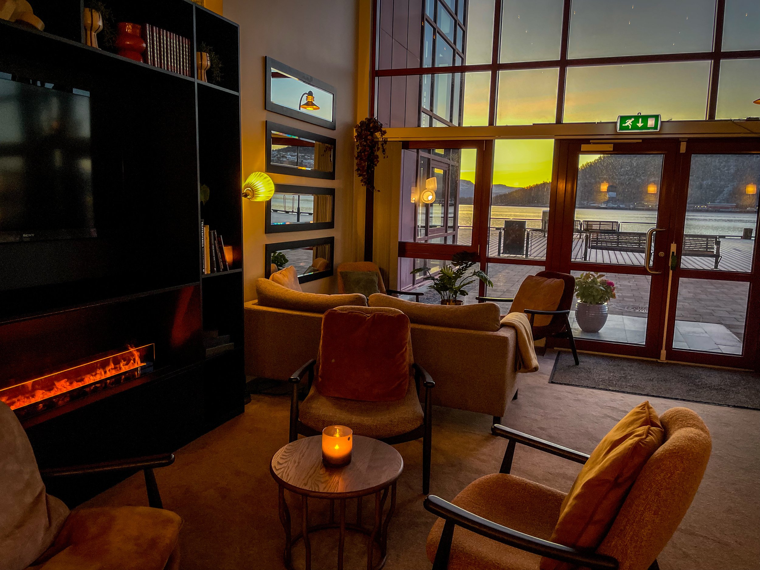 By the time we rolled into town, darkness had already settled over the harbor. I had secretly hoped for northern lights, but the sky stayed quiet. The app said 3 %, which in northern terms means: not tonight. I had booked a room at Home Hotel Arcticus and was welcomed with an upgrade, lucky me! Dinner was included at the hotel – traditional Norwegian meat patties, simple and hearty, not much for the camera but comforting after a long day of travel.