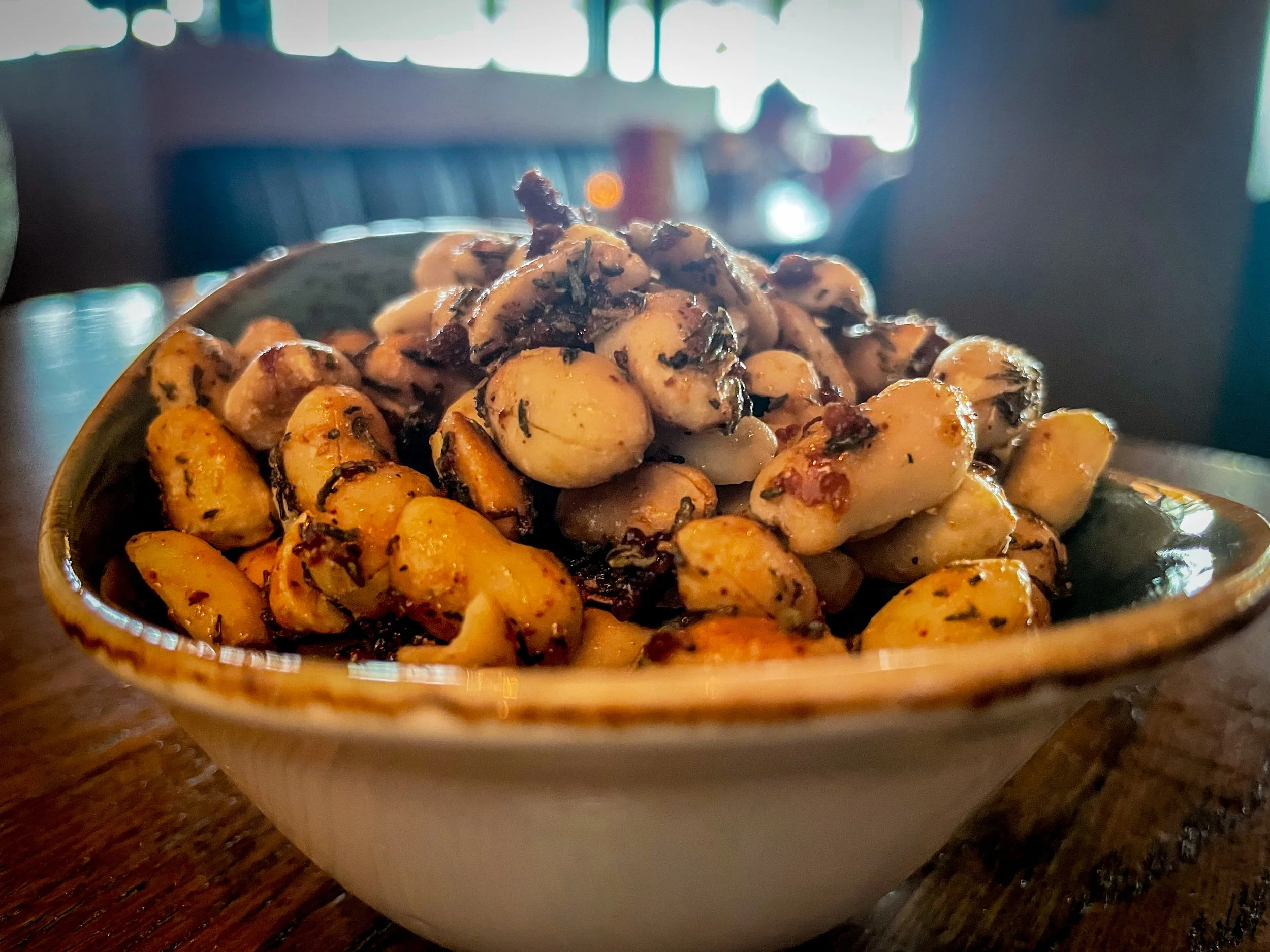 On the table came the maple sirup-glazed peanuts with bacon first. Sweet, salty, smoky – and honestly a bargain. In any regular bar you’d pay the same for plain peanuts, here they’d actually made an effort. Glazed in syrup, tossed with bacon – snack luxury.